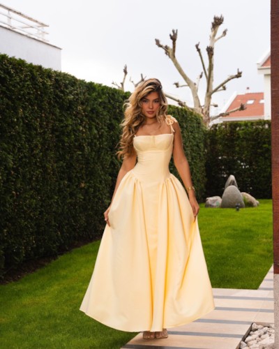is enchanting pastel yellow dress radiates charm and elegance, perfect for a garden party or a formal spring event. Designed with a structured, square neckline and delicate tie-up shoulder straps, it offers a romantic and youthful appeal. The bodice is fitted, accentuating the waist before flowing into a voluminous skirt that adds graceful movement and a fairytale-like silhouette