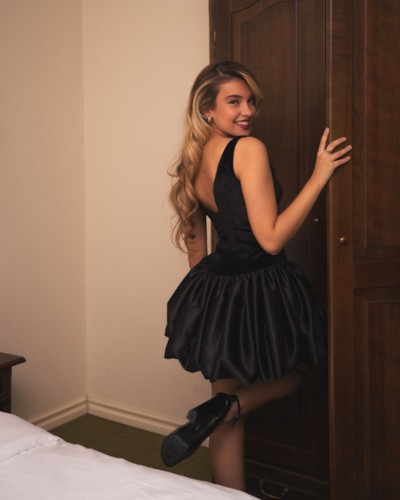 This short black dress is a bold yet playful statement piece, combining structured volume with sleek sensuality. The standout feature is its bubble hem a voluminous, rounded silhouette at the skirt that adds body and shape, creating a fun, youthful flair. The hem gently curves under, giving the dress a sculpted, balloon-like effect that bounces with every step. Perfect for cocktail parties, upscale nights out, or trend-forward events, this dress is a blend of fun volume and sultry minimalism a little black dress reimagined with a bold, modern twist.