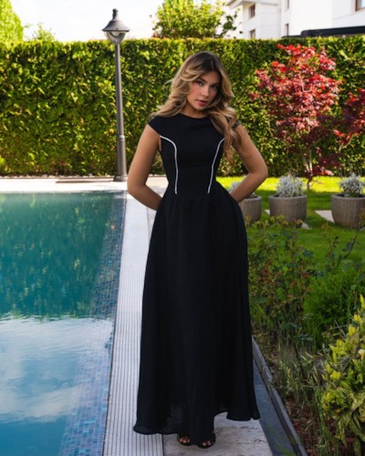 This elegant black maxi dress exudes timeless with a modern twist. The dress features a sleek, form-fitting bodice that gently flares out and subtle white details along the front add a touch of contrast and structure, enhancing the vertical lines of the design. The sleeveless cut and high neckline keep the look polished and graceful, perfect for evening occasions or upscale daytime events.