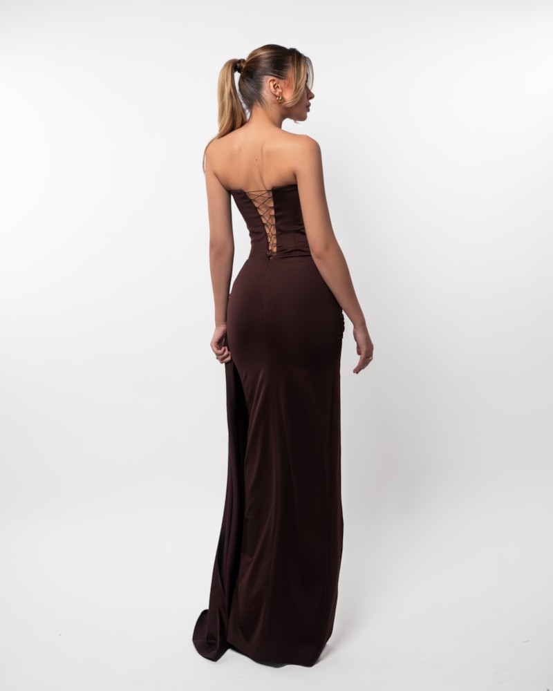 This floor length gown in a luxurious brown color is the essence of glamour.