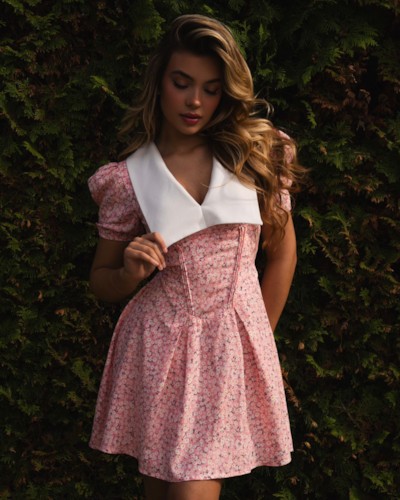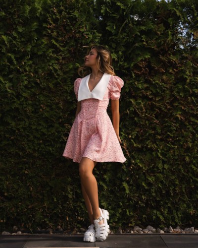 A cute pink floral mini dress with puff sleeves, a flared skirt, and a standout oversized white sailor collar. Feminine and playful perfect for casual dates, brunch with friends, picnics, garden parties, or any spring and summer outing.