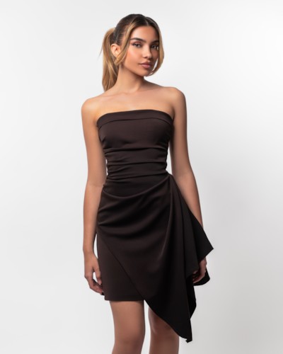 A strapless mini dress in a rich dark brown featuring a fitted bodice with a straight, folded neckline that highlights the shoulders. The asymmetrical skirt wraps across the front with a handkerchief. It’s a chic, modern look perfect for a night out or cocktail party.